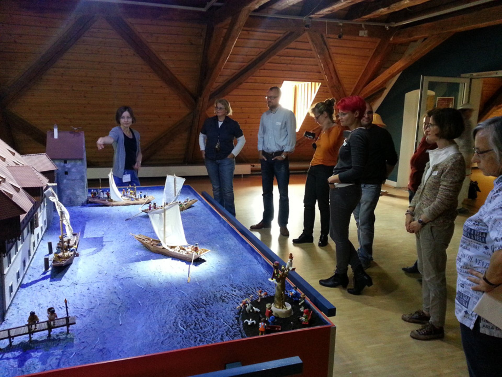 Nach der Mittagspause wurden die Teilnehmer in drei Gruppen aufgeteilt. Eine Gruppe besuchte die Ausstellung „Voll bis unters Dach“ Archäologie und Playmobil im Archäologischen Landesmuseum, eine weitere die Ausstellung „Konstanz um 1414. Städtischer Alltag zur Zeit des Konzils“ im Rosgarten Museum, dem Stadtmuseum der Stadt Konstanz. Die dritte Gruppe blieb im Konzilsgebäude. In allen drei Museen wurden die jeweiligen Ausstellungen und museumspädagogischen Begleitprogramme zum Hauptthema „Konzil“ vorgestellt. Nach regen Diskussionen und praktischen Workshops kehren die Tagungsteilnehmer wieder ins Konzilsgebäude zurück, um in der Abschlussrunde über die Eindrücke und Erfahrungen zu berichten. Es entstand eine rege Diskussion um Ausstellungspräsentation und deren Wirkung auf die Besucher und um Zielgruppenvorstellungen der jeweiligen Ausstellungen.