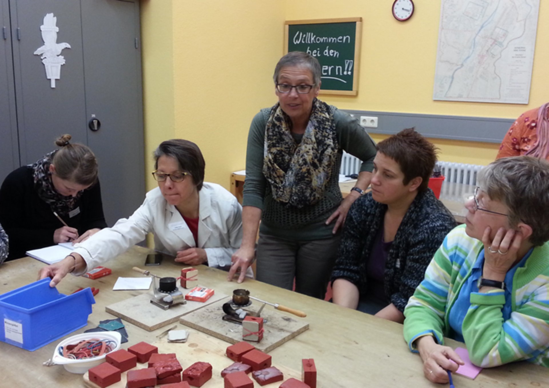 Nach der Mitgliederversammlung sowie einem gemeinsamen Mittagessen stellte das Dominikanermuseum am Nachmittag seine museumspädagogischen Angebote für Gruppen und Einzelbesucher vor. So konnten die Teilnehmer zum einen mit einem virtuellen Museumsquiz, aufgespielt auf ein I-Pod, die Inhalte der die römische Dauerausstellung vertiefen. Zum anderen erläuterte Museumspädagogin Frau Votteler. die insgesamt sechs Kreativangebote für Gruppen: Mosaike legen, Schreibtafeln aus Wachs gestalten, Schmuck (Arm- und Fingerringe) aus Aluminiumdraht formen, Münzen gießen, auf Papyrus schreiben sowie einen Lederbeutel als Spielbrett gestalten. Zu jedem Angebot erläuterte Frau Votteler anhand der jeweiligen Materialien die Ausgestaltung des Angebotes sowie Erfahrungswerte aus der Praxis. Anschließend durften die Teilnehmer selber Zinn über offenem Feuer schmelzen und daraus römische Münzen gießen. Die Begeisterung, die dabei auf alle Anwesenden übersprang, verdeutlichte einmal mehr, dass museumspädagogische Angebote auch für Erwachsene eine Bereicherung darstellen können und dürfen.