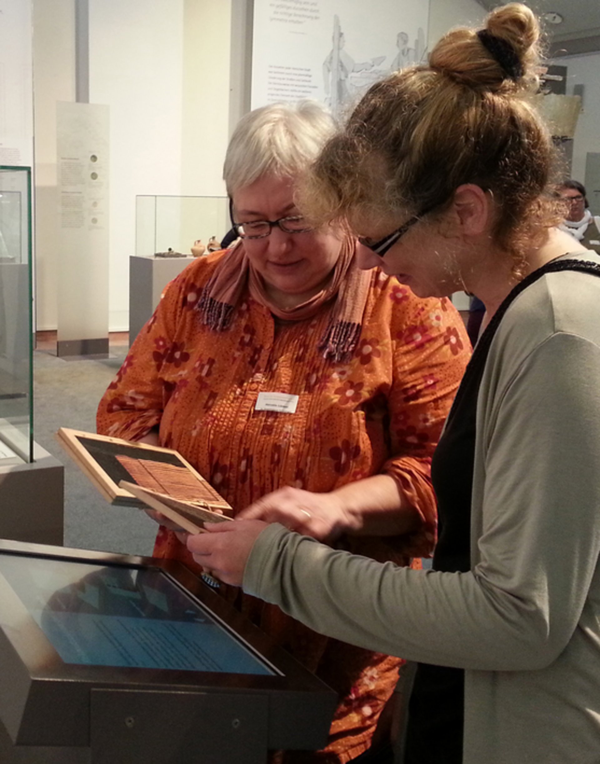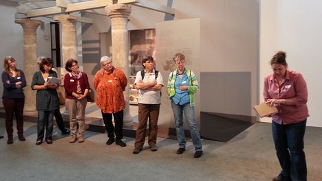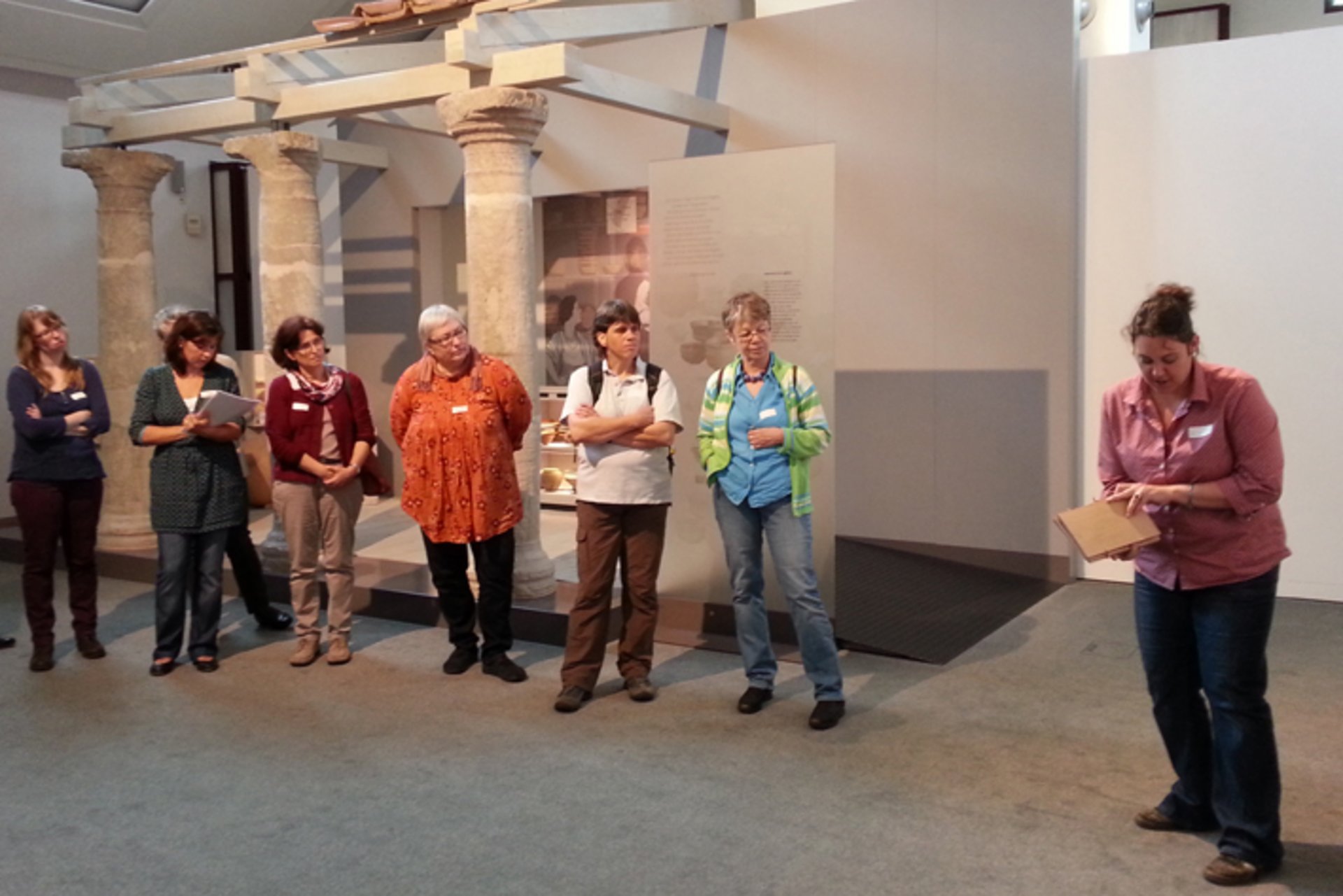 Ein abwechslungsreiches Programm erwartete die Teilnehmer der jüngsten „Einblicke“-Tagung im Dominikanermuseum in Rottweil. In ihrer kurzen Begrüßung erläuterte die Leiterin Frau Martina Meyr zunächst Geschichte und Aufbau ihres Hauses. So besteht das Dominikanermuseum aus drei unterschiedlichen Abteilungen: Römische Geschichte in Rottweil, Sakrale Kunst sowie eine Sammlung von Gegenwartskunst in der Trägerschaft mehrerer Institutionen. Während des Vormittags führte Frau Meyr die Tagungsteilnehmer durch die 1992 eröffnete und 2009 bis 2011 komplett umgestaltete Abteilung der römischen Geschichte Rottweils. Die Ausstellung wurde dabei bewusst unter das Motto „Römische Stadt“ gestellt, da im heutigen Baden-Württemberg nur Rottweil einen römischen Stadtrechtsstatus nachweisen kann und somit als älteste Stadt Baden-Württembergs gilt. Als roter Faden durch alle Ausstellungsbereiche dient für Besucher der fiktive Tag einer römischen Familie, auf deren Familienmitglieder an den jeweiligen Plätzen der Stadt unterschiedliche Begegnungen und Aufgaben warten. Während die Ausstellungsarchitektur bewusst auf eine eher schematische Ausgestaltung unter Einbeziehung originaler Bauteile abzielt, wenden sich zahlreiche museumsdidaktische Elemente direkt an die Besucher. So zeigt ein dreiteiliges Tontäfelchen „zum Anfassen“ die Schriftlichkeit in römischer Zeit. Auch im Untergeschoss, beim Thema Baugeschichte und Topographie des römischen Rottweils, kann man sich an einem Bildschirm in dreidimensionale Simulation einzelner Gebäude vertiefen. Zum Bereich „Militär“ dürfen die Besucher schließlich auf einem stilisierten Pferd mit rekonstruiertem zeittypischem Sattel Platz nehmen. Die nachfolgenden Themen ergeben sich durch die örtliche Fundgeschichte wie z.B. dem Orpheus-Mosaik, Römische Bäderkultur oder Bestattungsrituale. Auch hier sorgen Hörstationen zur kulturgeschichtlichen Rezeption der Orpheus-Sage sowie römische Spiele zum Ausprobieren für eine moderne museumsdidaktische Konzeption.