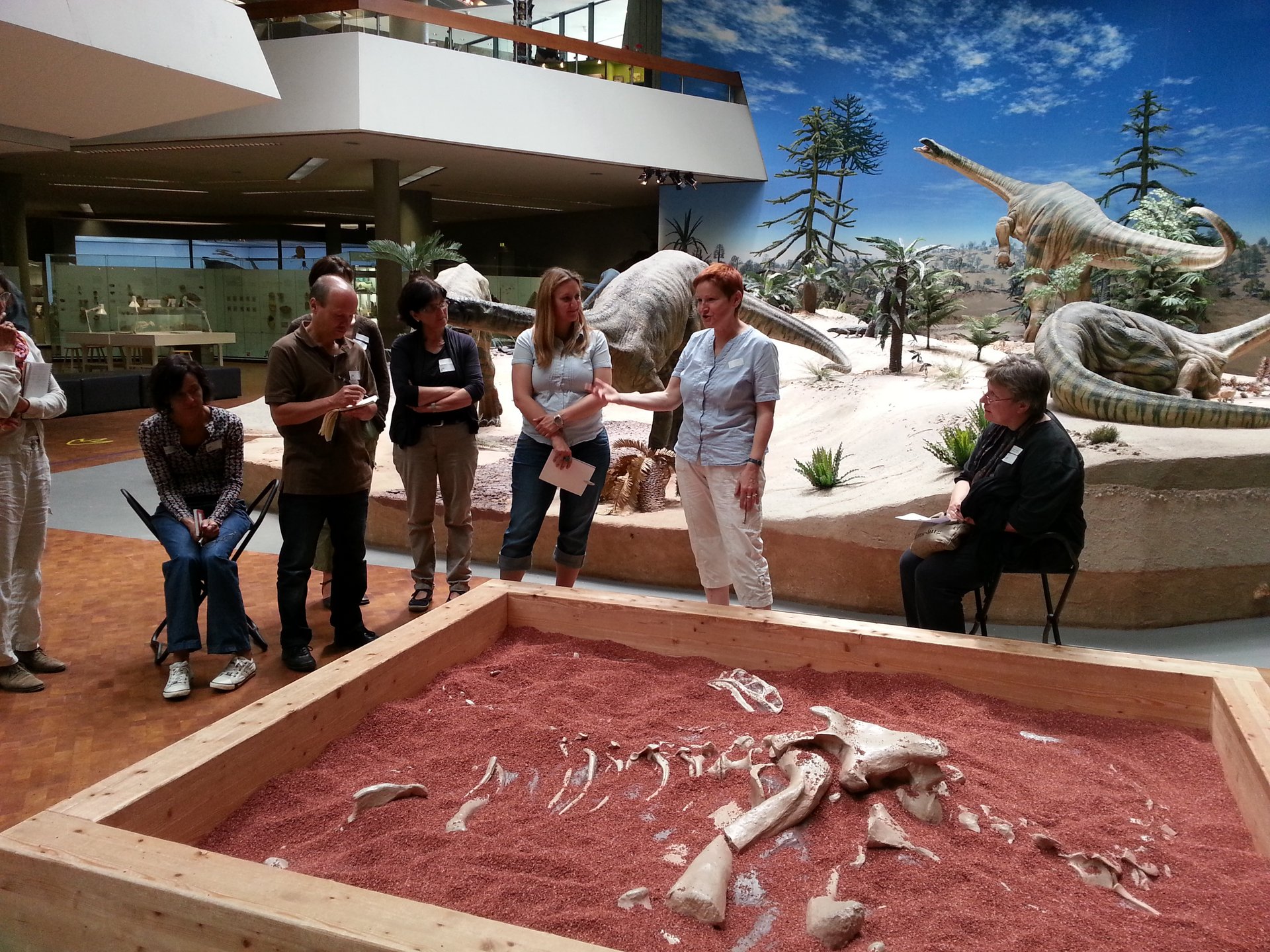Gut 20 Teilnehmer folgten der Einladung des Vereins für Museumspädagogik e.V in das Staatliche Museum für Naturkunde in Stuttgart. Nach der Begrüßung durch die Vereinsvorsitzende Doris Moyrer führte die Museumspädagogin Dr. Ursula Lauxmann zunächst in die Strukturen der beiden Ausstellungsgebäude des Museums ein. Während im Schloss Rosenstein, dem älteren Teil, die Biologie den thematischen Schwerpunkt bildet, ist im Museum am Löwentor die Paläontologie beheimatet, die - und das ist bemerkenswert - vor allem aus Fossilienfunden aus Baden-Württemberg besteht. Es folgte ein Rundgang durch die 2008 neugestaltete Dauerausstellung des Museums am Löwentor. Durch diese zieht sich die „Dreiheit“ von Diorama, Original und Fundstelle. Den einzelnen Dioramen sind in der Ausstellung Originalfunde sowie Nachbildungen der Fundstellen zugeordnet. Die TeilnehmerInnen zeigten sich sehr beeindruckt von den lebensgroßen und lebensecht gestalteten Dioramen und den teilweise einzigartigen Funden ganzer Tierskelette. An einigen Fundstellen können die Besucher selbst zu Forschern werden und sich an Workshop-Stationen aktiv die Inhalte der Ausstellung erarbeiten. Neben praktischen Hinweisen zur Mammutfell-Konservierung und Dioramenpflege, erfuhren die TeilnehmerInnen viel Neues und Überraschendes über die klimatischen Veränderungen der Erde, so auch, dass sich die Welt gerade - trotz der Klimaerwärmung - in einer Kleinen Eiszeit befindet.