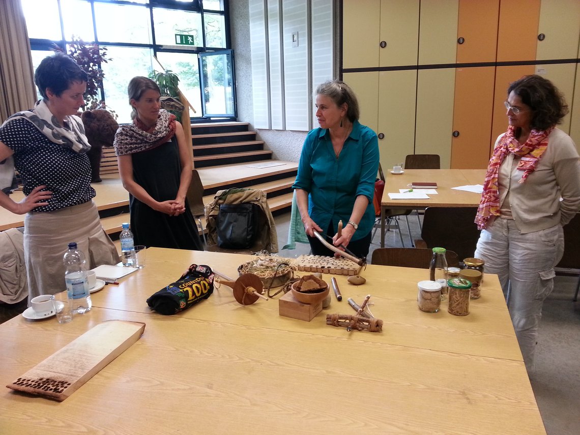 In zwei Gruppen aufgeteilt durften die Anwesenden dann sowohl einen „Blick hinter die Kulissen“ wagen als auch selbst „Feuer machen.“ Der „Blick hinter die Kulissen“ führte in die weitverzweigten Katakomben des Museum und bot einen seltenen Einblick in die praktische Sammlungsarbeit des Museums, namentlich der Mammologie mit gut 5000 Objekten und zahlreichen Typenexemplaren, der Entomologie mit ihren unzähligen Insekten und der Botanik mit über 1 Millionen Belegexemplaren. Im Praxisteil versuchten sich die TeilnehmerInnen selbst am museumspädagogischen Schulklassenprogramm „Das Feuer der Steinzeit“ (ab Klasse 4) am Feuer machen mithilfe von Bogen-, Seil- und Schwingbohrer – eine schweißtreibende Aufgabe, bei der durch heftiges Drehen und Reiben zunächst Rauch entsteht, bevor im Idealfall der Funke (auf den Zunderschwamm) überspringt. Eine andere Art des Feuermachens demonstrierte die Museumspädagogin Cornelia Lauxmann zum Abschluss – mithilfe eines Feuersteins und –eisens und Brennmaterialien entfachte sie ein Schalenfeuer.