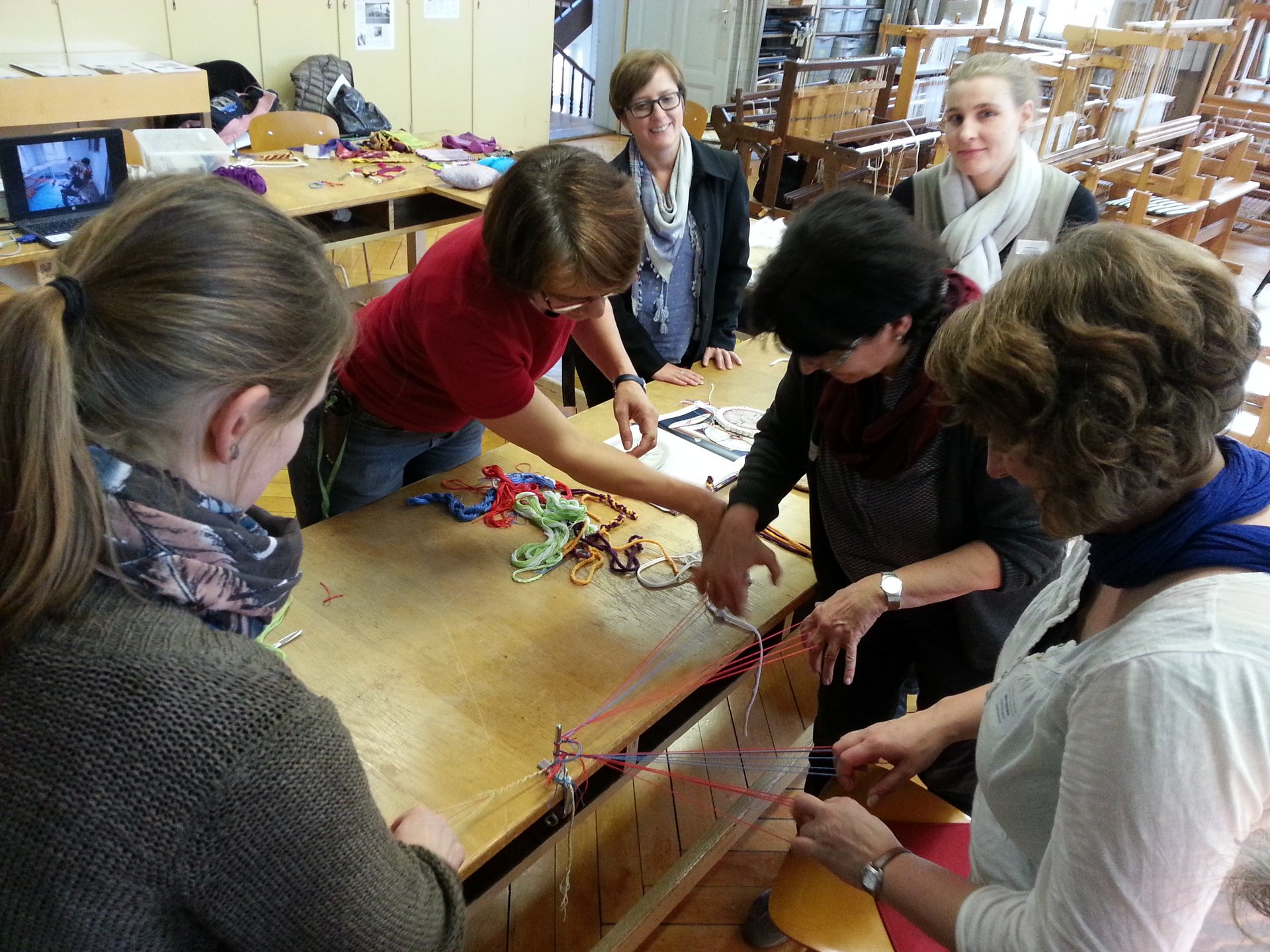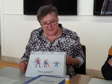Am Nachmittag durchliefen die TeilnehmerInnen drei museumspädagogische Stationen: Sie betätigten sich künstlerisch an einer kids@kita-Station zum Thema Wasser, unternahmen eine Märchenreise im Stadtmuseum mit Befüllung einer eigenen Schatzkiste und lernten im Webereimuseum verschiedene Knüpf- und Häkeltechniken kennen.