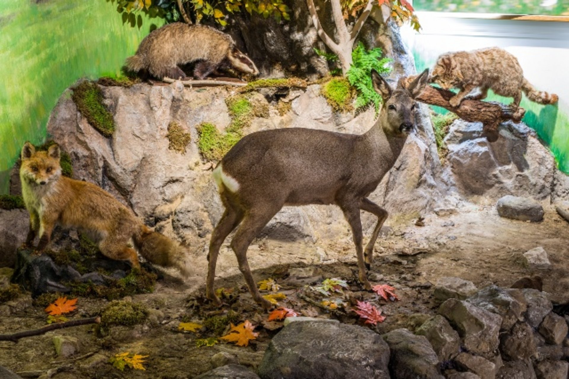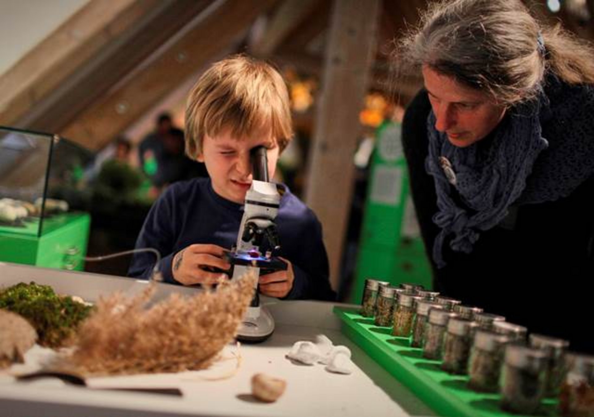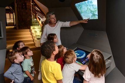 Bei einem Rundgang durch die Ausstellungsräume im Dachgeschoss des Ritterhauses erläuterten Kuratorin Anne Junk und die Leiterin der Museumspädagogik Nadine Rau die Ausstellung mit ihren offen gestalteten Dioramen und den zahlreichen Mitmach- und Hands-On-Stationen. So können z.B. am Forschertisch Naturmaterialien genau unter die Lupe genommen und duftende Kräuter erraten werden, verschiedene Hörstationen bieten auf Knopfdruck unterschiedliche Tierstimme an, ein Moosbett lädt zum Ausspannen, Zurückziehen oder Lesen ein, an mehreren Fühlstationen können verschiedene Felle oder Hölzer ertastet werden, und ein Präparatorentisch erklärt kindgerecht, wie die Tiere ins Museum gekommen sind. Zentral im Raum wurden Tische geschaffen, die für museumspädagogische Kurse genutzt werden können und für Einzelbesucher zahlreiche Spiele und Bastelmöglichkeiten parat halten. Auf einer frei schwebenden Empore unter dem Dach wurde die geologische Sammlung untergebracht. Hier leitet eine Zeitmaschine in das Thema ein. Per Knopfdruck geht es z.B. in das Zeitalter Perm oder die Steinzeit. Ein Puzzle erläutert die geologische Beschaffenheit der Ortenau, in einem Bergwerksstollen sind verschiedene Gesteine untergebracht und ein Mineralienkabinett präsentiert mit verschiedenen interaktiven Stationen seine steinerne Schätze. Auch in diesem Ausstellungsbereich werden die einzelnen Themenbereiche durch Kinderfragen eingeleitet – da es in einem Stollen jedoch doch recht dunkel ist, erläutert ein Audioguide die Antworten.