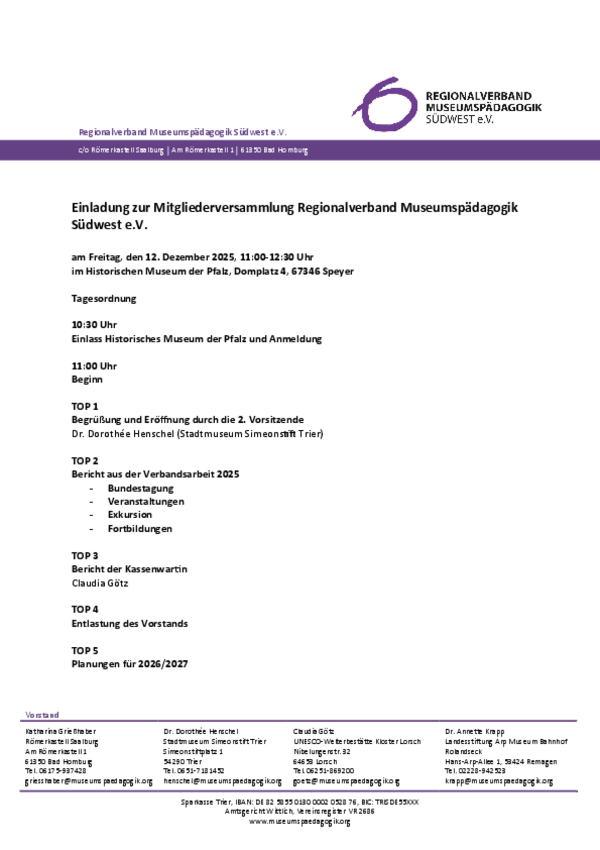 Einladung zur Mitgliederversammlung 2025 im Historischen Museum der Pfalz Speyer