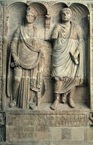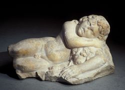 Zwei der römischen Museumsexponate, die zum Thema "Unsterbliche Liebe" eine Rolle spielen: Das Grabdenkmal des Albinius Asper und seiner Frau Secundia Restituta sowie die Marmorfigur eines schlafenden Amor.